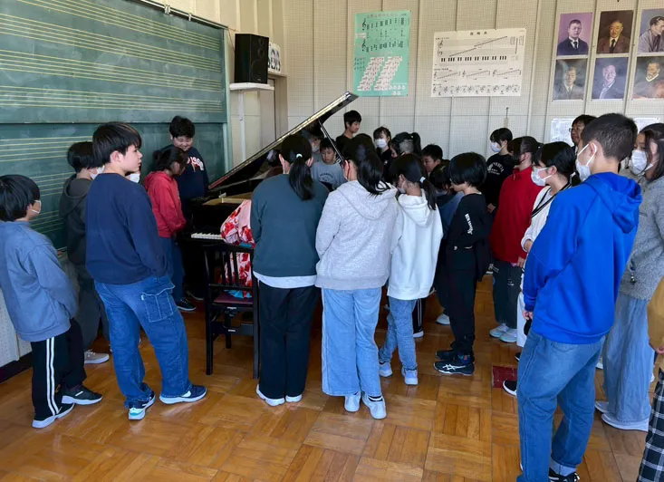 志津川小学校の5,6年生は、皆さん明るく感性も柔らかで、熱心に演奏に耳を傾けてくれたり、こちらの質問にもたくさん答えてくれました!教室のあちこちで音を体感して響きの違いを感じてもらいましたが、ピアノのそばでは、音楽に合わせて体を動かしてくれたり、表情や指の動きも熱心に見てくれました。楽器についても、ヴァイオリンやピアノの細かいところまで見て、様々な奏法にも気付いたり、音の表情の違いも感じてくれたことが心に残りました。最後には「ラデツキー行進曲」で皆さんの手拍子とヴァイオリン・ピアノとの共演体験をし、武内先生にも指揮でご参加いただきました。