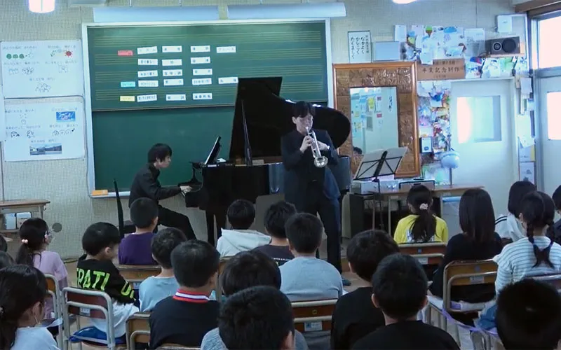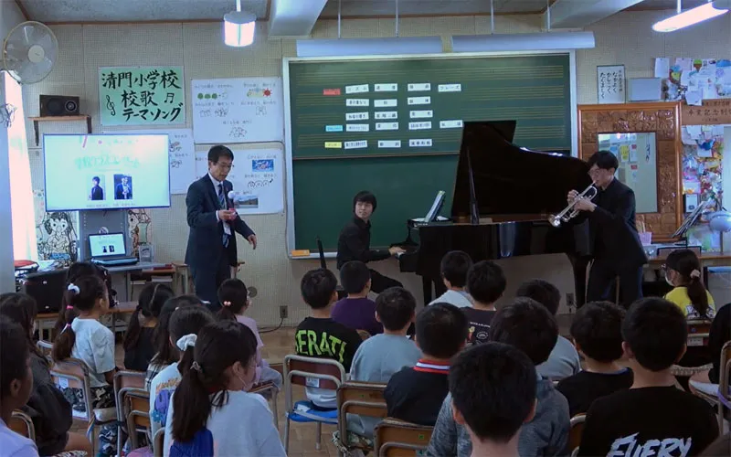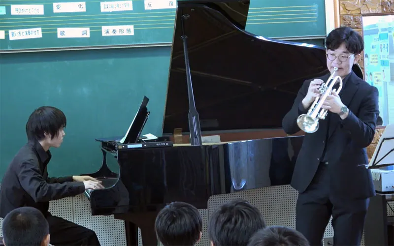 今年の草加市第1校目、清門小学校にはピアニストの神宮司悠翔さん(2022年特級銀賞)とトランペット奏者の中島実樹也さんが訪れました。