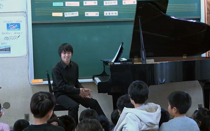学校クラスコンサートは初、という神宮司さん。穏やかで優しい語り口に、子どもたちが耳を澄ませます。「ピアノの鍵盤はいくつあるか知ってる?」とクイズを出してから、「これから弾くモーツァルト、という、教室の後ろにも貼ってある作曲家の時代には、こんなになくて、60鍵くらいしかありませんでした。」と次の曲へと誘います。