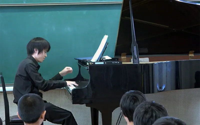 リストの超絶技巧『雪あらし』の演奏の前に神宮司さんは「みんなは、雪あらしって聞くと、どんなイメージを持ちますか?」と尋ねます。「静かなものから激しいものまで、みなが思う雪嵐をイメージしながら聴いてね」と言うと、学校のピアノを確かな技巧で表現豊かに奏でました。