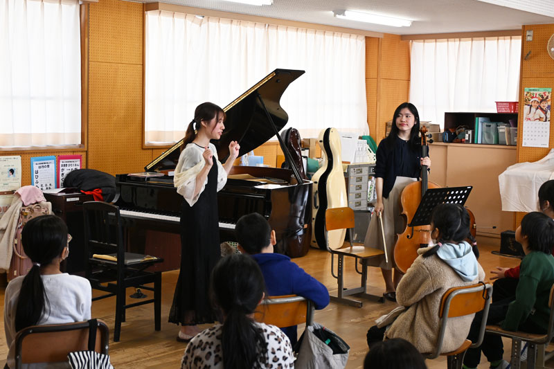 12月17日には北本市立中丸小学校にて学校クラスコンサートが開催されました。演奏にはピアニストの横田結子さんとチェリストの上條里紗さんが訪れました。