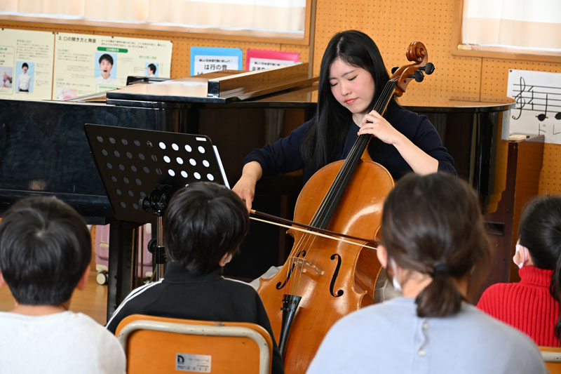 今回のクラスコンサートでは元気で明るい雰囲気で、演奏がはじまると児童の皆さんがチェロの音色を静かにじっくりと聴いてくれていたのが印象的でした。