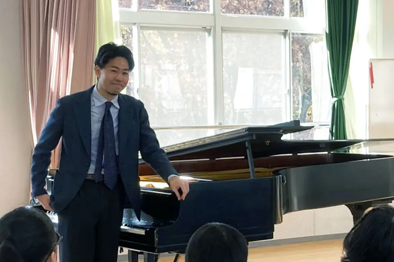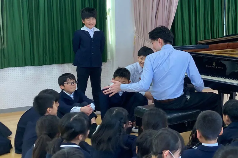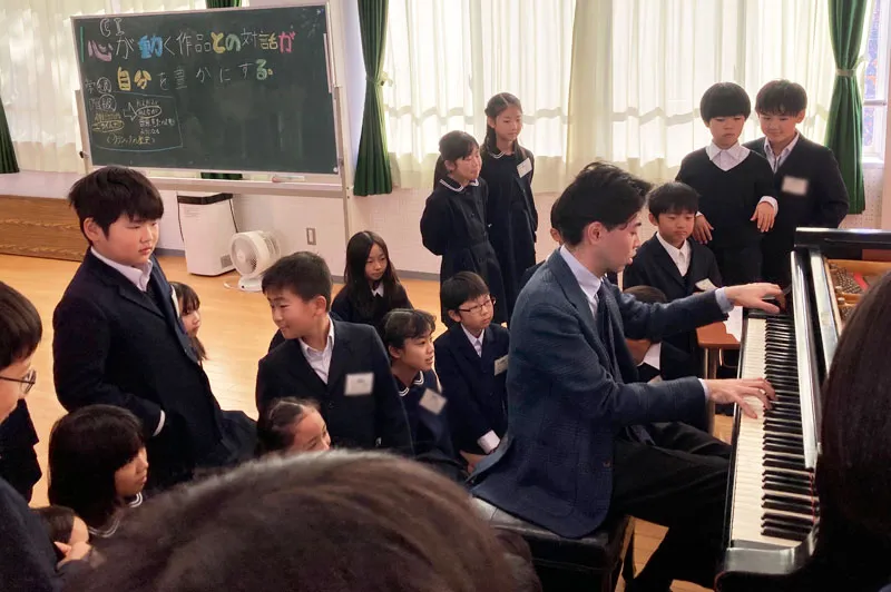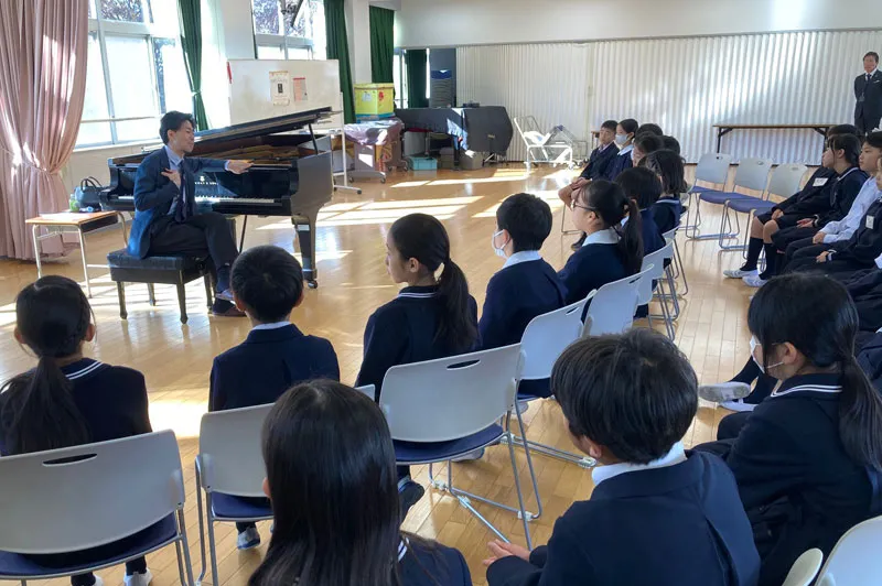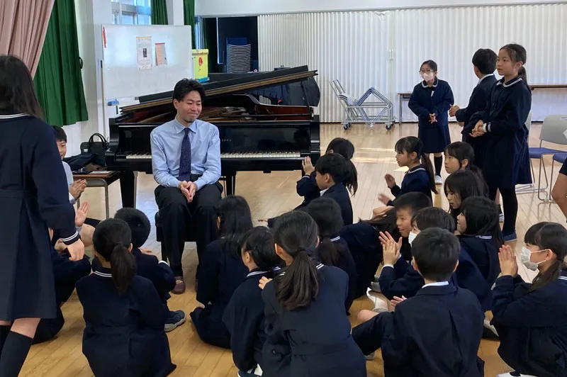 12月1日には、東京学芸大学附属大泉小学校にてピアニスト・嘉屋翔太さんによる学校クラスコンサートが開催されました。「音楽」の授業ではなく4年生の「探究」の授業としての初めての取り組みに向け、4年生の担任の先生方と演奏者である嘉屋さんと一緒に話し合いを重ねながら授業案をつくっていきました。
