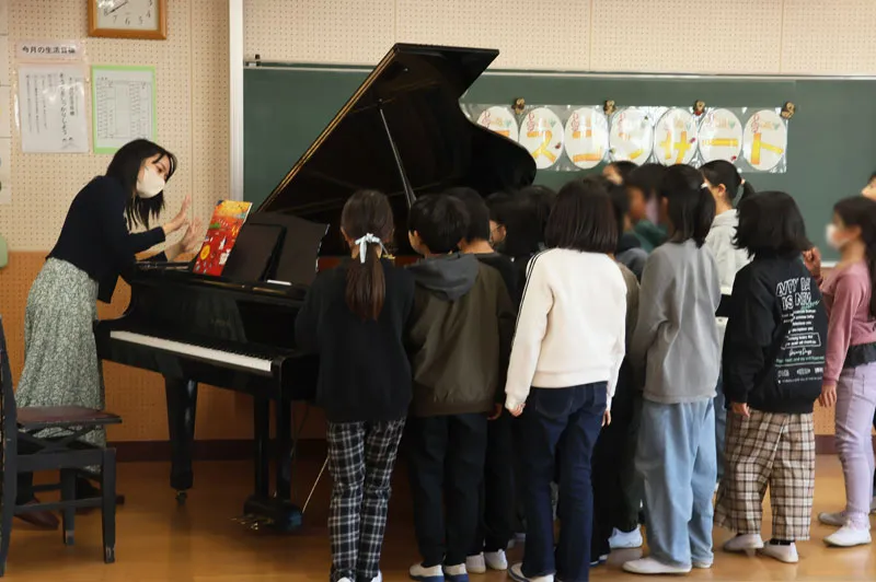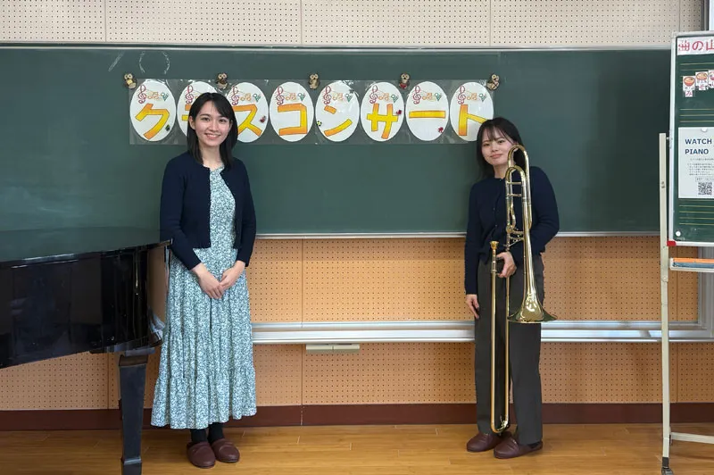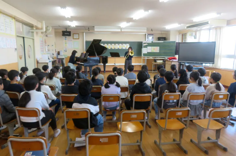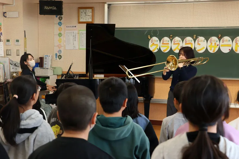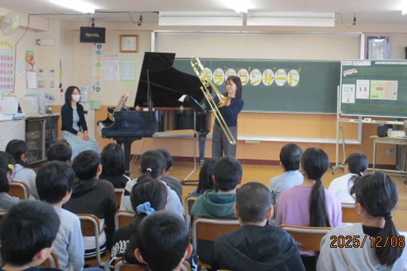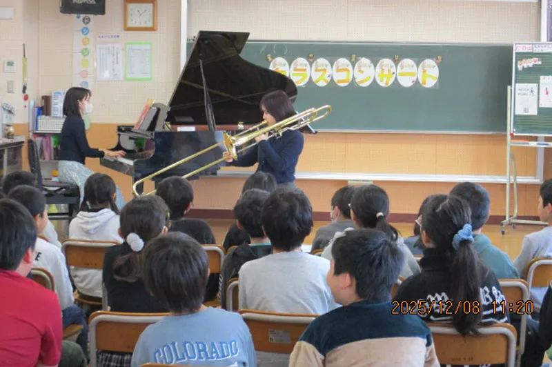 12月8日には北本市立西小学校にて学校クラスコンサートが開催され、ピアニストの堤莉咲子さんとトロンボーン奏者の安久津理子さんが演奏に訪れました。