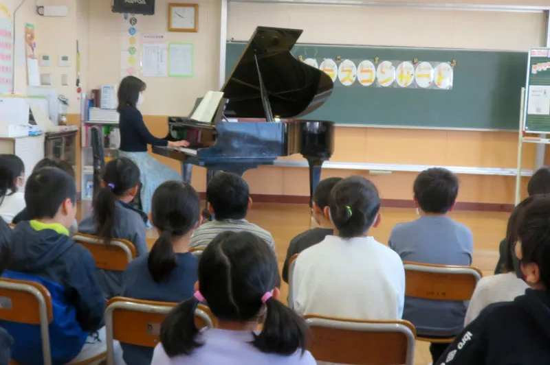 今回は2クラス分担当させていただきましたが、どちらも元気のよい生徒さんで、一緒に演奏した「赤いやねの家」では素敵な歌声を聴かせていただけました。