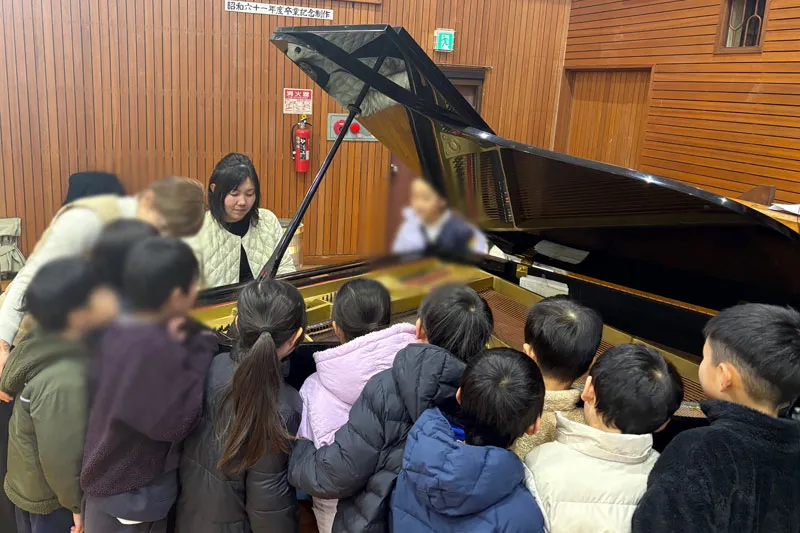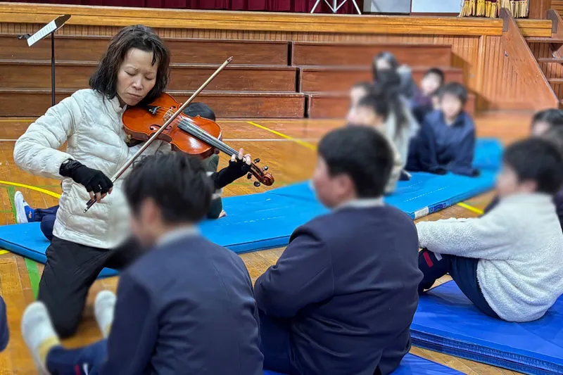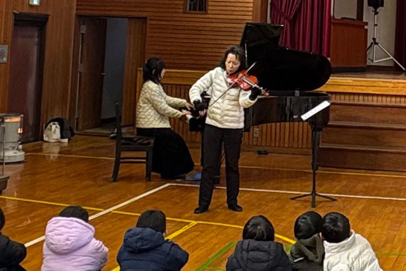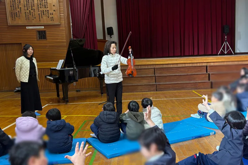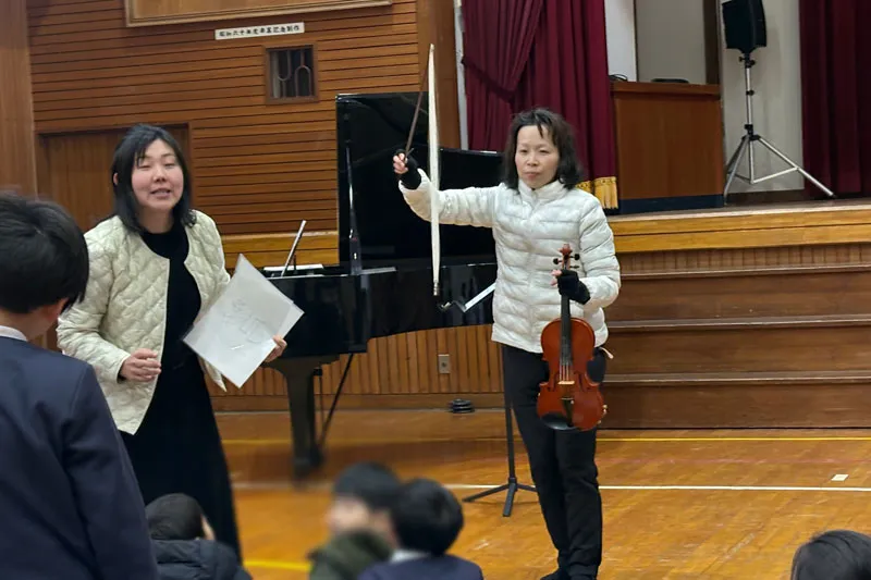 1月21日に泉南市立東小学校にて学校クラスコンサートを開催し、ピアニストの紀之定郁恵さんとヴァイオリニストの石田知子さんが演奏されました。