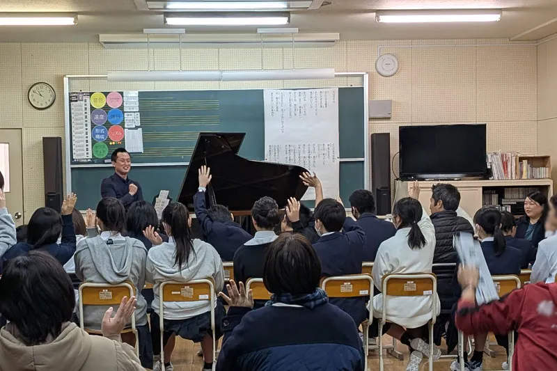 コンサートは、大賀郷中学校の全学年の生徒、教職員、地域の方々を対象に、50分2公演で実施されました。長井先生のプログラムは、親しみやすい楽曲から本格的なピアノ演奏、干田先生との声楽共演、生徒や観覧者との対話、合唱での共演など、非常に多彩な内容で構成され、あっという間の50分となりました。生徒がピアノを囲み、音の響きを間近で感じながら鑑賞する姿はとても印象的でした。