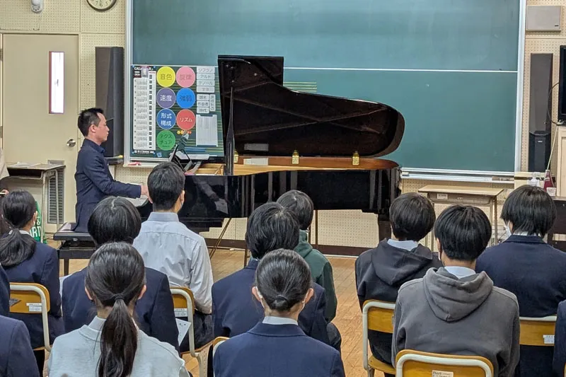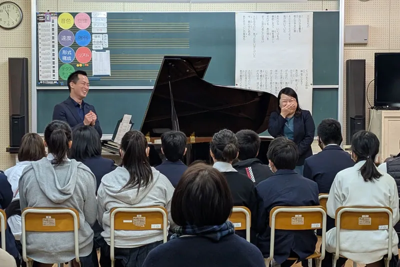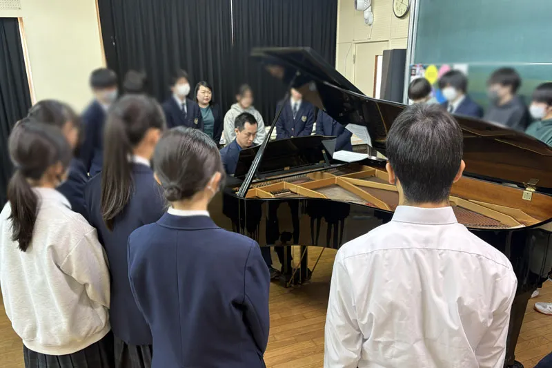 実現に向けては、大賀郷中学校音楽科の干田美鈴先生に直接ご相談し、校長先生にもお話をつないでいただいたことで、授業の一環として開催する運びとなりました。後に、出演をお願いした長井進之助先生と干田先生が同大学の同級生であったことが分かり、この不思議なご縁が今回の企画を自然に後押ししてくれているように感じました。準備期間中には、台風被災やピティナ・ピアノステップの延期など、思うように進まない時期もありましたが、ピティナの温かいご支援と丁寧なご対応に支えられ、無事に当日を迎えることができました。