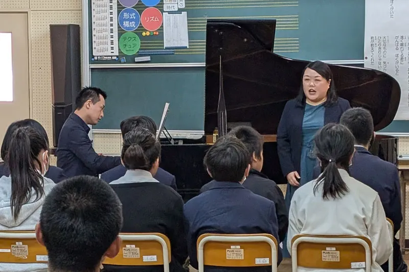 今回ご縁により長井先生と一緒に共演させていただきました。私自身は、授業のほかに地域のコンサートなどでよく歌っていますが、授業中はいつも私一人なので、伴奏していただいて本来の形で生徒に歌曲を聴いてもらったのは初めてです。選曲した日本歌曲は「浜辺の歌」と「荒城の月」という渋い曲でしたが、生徒たちはいつもより集中して聴いていたと思います。長井先生のおかげです。また実施していただきたいです!