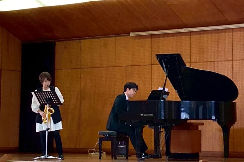 - ピアノをひいている時に、音の高さがだんだん変わるにつれて指の動きもなめらかに流れるようにひいていたのがすごいなと思いました。サクソフォーンの演奏の時は、体育館中に音がひびきわたってきれいでした。大きな音をひびかせていたので、肺活量がすごいんだなと思いました。サクソフォーンとピアノのデュオの時は、2つの楽器の音が重なって、きいている間、わくわくしていました。全校で「未来へ」を合唱した時、プロの人が弾くピアノにあわせると、みんなの声がいつもよりもきれいにひびいて聞こえました。