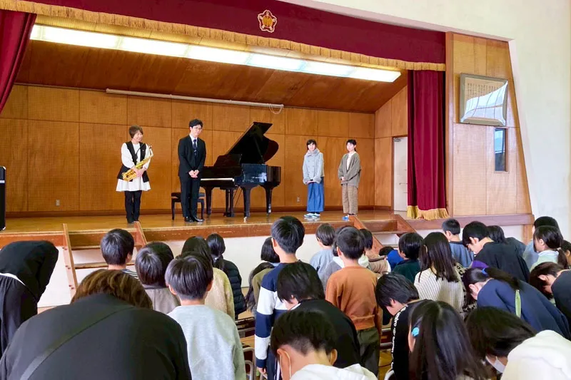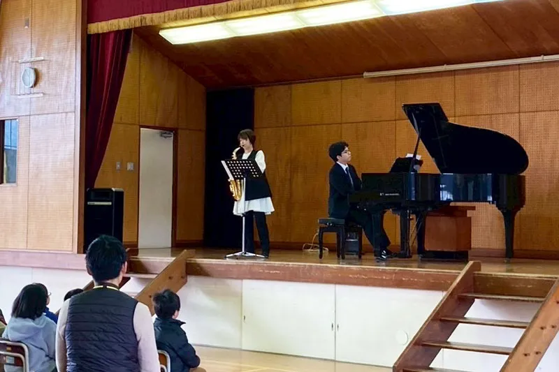 2023特級銅賞の神原雅治さんは、高知支部によるコンペティション入賞者記念コンサート「ブロッサムコンサート」へのゲスト出演の翌日、高知県のいの町立川内小学校を訪れ、初めての学校クラスコンサートに出演しました。共演は地元のサクソフォーン奏者の鑰尼佳代(かぎあま・かよ)さん。高知支部によるレポートと演奏者からのメッセージ、児童の皆さんの感想をお届けします。
