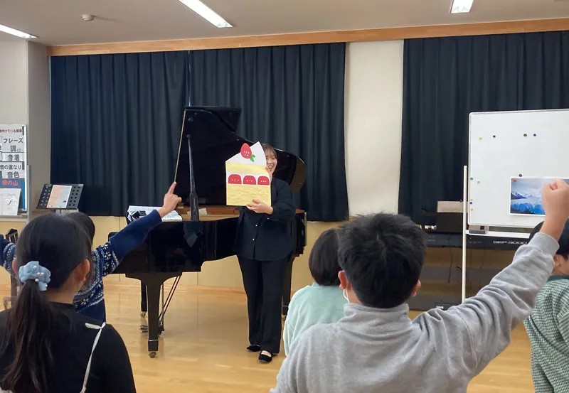 中でも特に心に残ったのは、《ポップコーン》を演奏した後のやりとりです。「ポップコーンがはねているのは分かったけど、どうして途中になめらかなところが出てきたんですか?」という質問があり、そこまで音楽の中身に疑問を持ってくれたことに驚きました。「なんでだと思う?」と問いかけると、「個体から液体になった感じがした」「キャラメルを溶かして流し入れているところじゃない?」「甘くておいしいポップコーンをほおばって、幸せいっぱいな場面だと思う」と、想像力あふれる答えが返ってきました。こちらの想像を超える答えに、子どもたちが音楽を自分の感覚で受け取っていることを強く感じ、深く感激しました。