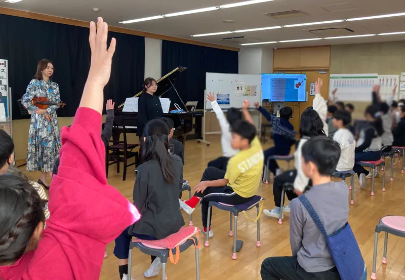 コンサートの最後は、児童にも参加してもらい、校歌を一緒に演奏しました。質問コーナーでは、「そんなに早く指を動かして、こんがらないのですか?」と子どもならではの目線に、微笑ましくなる場面もありました。