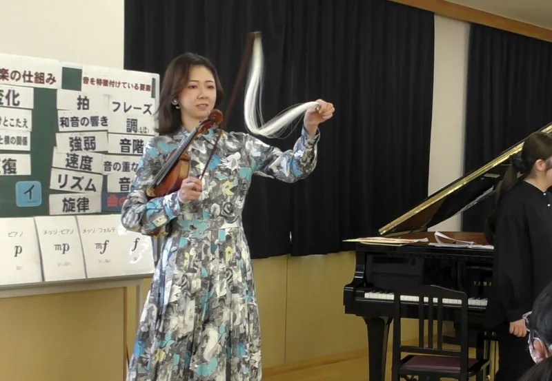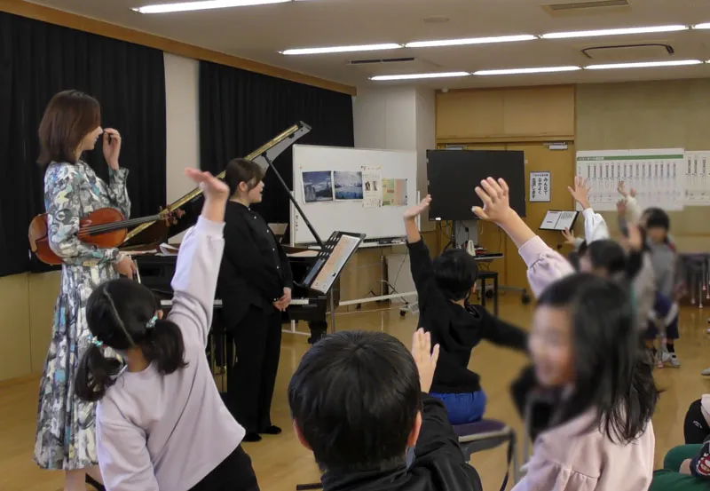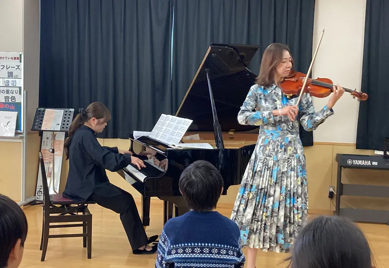 また今回は、共演してくださったヴァイオリニストの髙倉さんに、ヴァイオリンを初めて聴く児童も多い中で、その魅力を存分に味わえるモンティの《チャルダッシュ》を演奏していただきました。フラジオレット、グリッサンド、ピチカートといった特殊奏法を紹介しながら、導入として《スーパーマリオのテーマ》を演奏してくださり、子どもたちがとても嬉しそうな表情を浮かべていたのが鮮明に記憶に残っています。ヴァイオリンを初めて聴く児童も多い中で、子どもたちが一気に音楽に引き込まれていく様子が印象的でした。