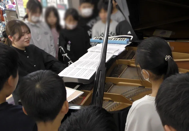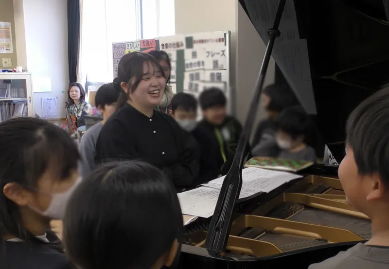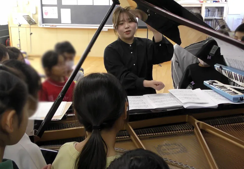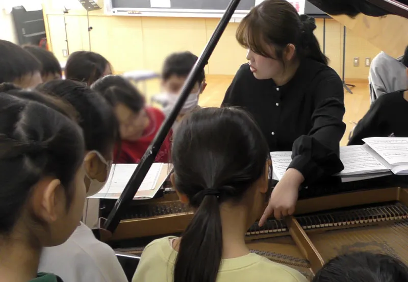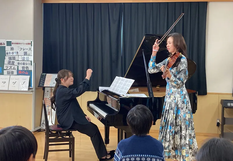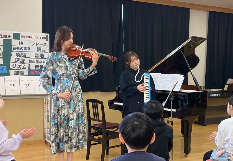 中休み、筆者が音楽室に足を踏み入れようとすると、親しみのある映画音楽と歓声が聴こえてきました。1クラス目が終わった休憩時間に、なんと児童からのリクエストに即興で応えていたようです。「もうすぐ次の授業があるんじゃない?」と声をかけるも、名残惜しそうな様子です。そんな即興にも応えてくださった今回の演奏者は、2025年の特級グランプリに輝いた稲沢朋華さん(ピアノ)。髙倉理紗子さん(ヴァイオリン)を迎え、稲沢さん初のクラスコンサートが開催されました。