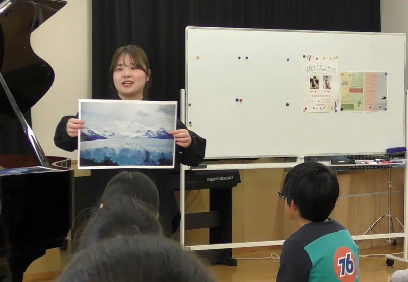 ピアノとヴァイオリンの1曲目は、ピアソラ作曲の『ブエノスアイレスの冬(一部省略)』。稲沢さんが日本の冬とは異なる壮大な風景の写真を見せると、そびえたつ氷河の様子に「寒そう~!」との声が上がりました。児童のイメージが膨らんだところで、演奏を開始します。