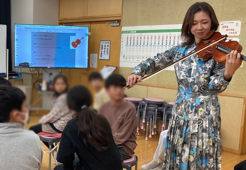 ヴァイオリンコーナーでは、弓の毛が何の動物の毛なのかクイズしてみたり、演奏技法の紹介として、マリオのテーマを演奏したり、皆さんの近くを回って演奏してみたりなど、各児童の表情を見ながら演奏できたこと、私としても嬉しくお勉強になりました。